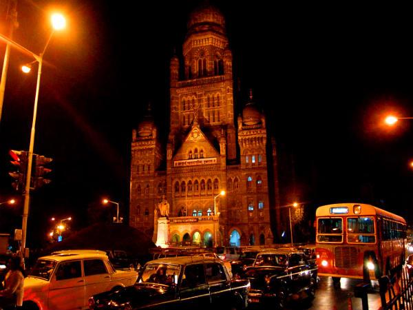 மும்பை கார்ப்பரேஷன் கட்டிடம் முன்பாக மாநகராட்சி பேருந்து, டேக்ஸிகள் உள்ளிட்ட வாகனங்கள் செல்லும் காட்சி.